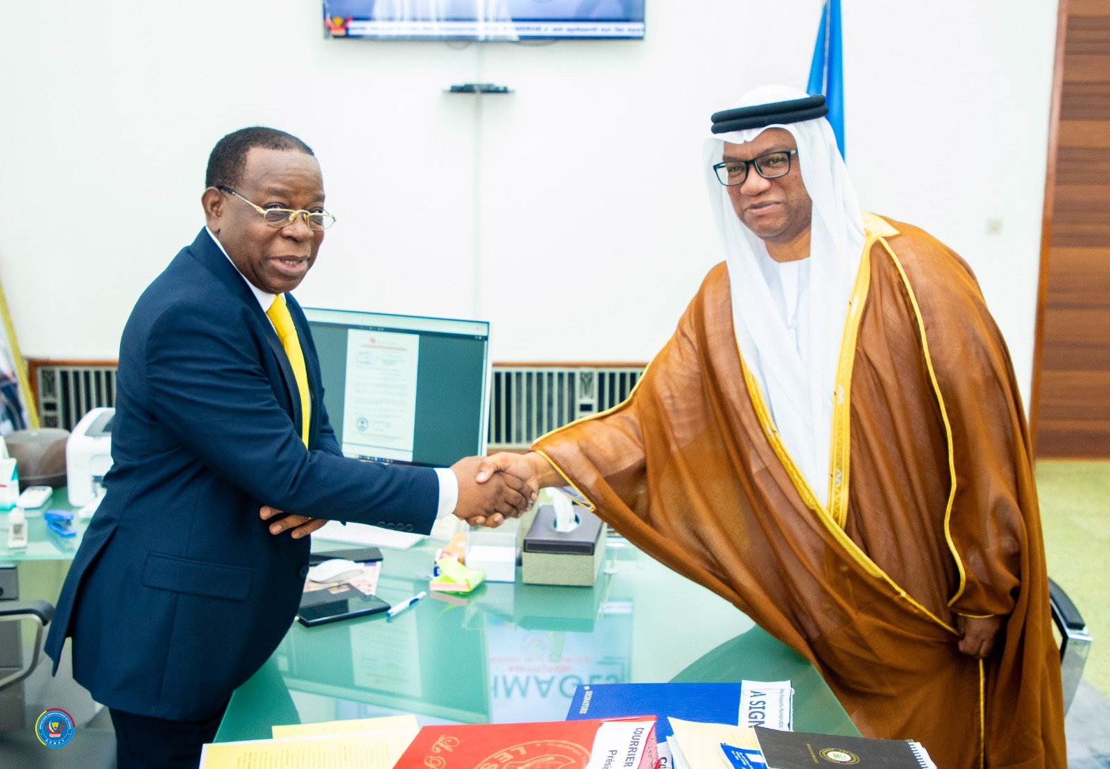A peine installé à Kinshasa, l’ambassadeur émiratis en Rdc, ANWAR OTHMAN BAROUT AL BAROUDI, a été reçu, le vendredi 13 octobre 2023, par le Président du Sénat, l’honorable Modeste Bahati Lukwebo, en son cabinet de travail, au Palais du peuple.