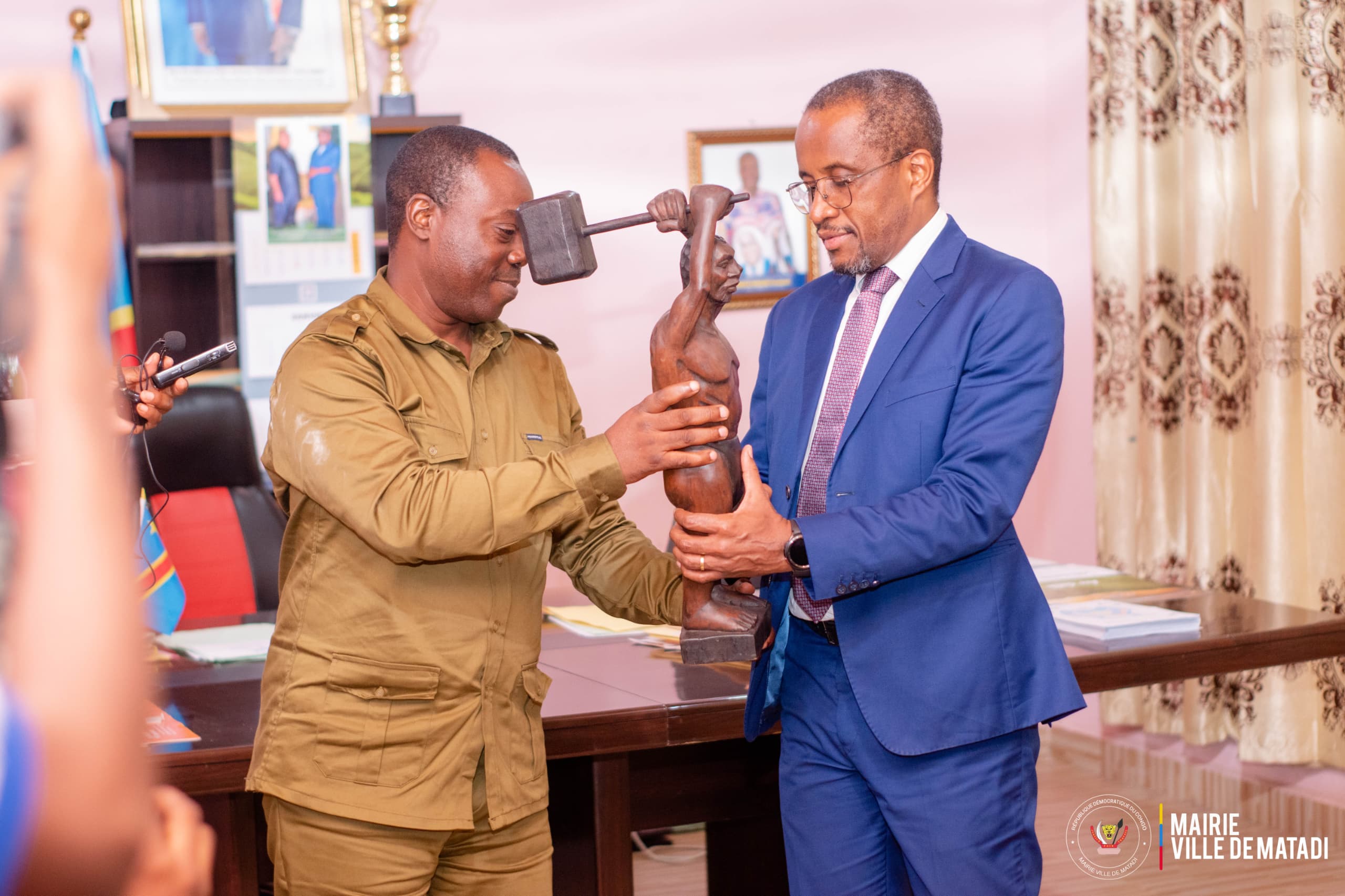 A la mairie de Matadi où il a été aussi bien accueilli, une statuette symbolisant les souffrances endurées par les ouvriers commis aux travaux de construction du chemin de fer Matadi – Kinshasa lui a été remise par le maire Dominique Nkodia Mbete afin que celle-ci serve d’ornement de son bureau de travail, en guise de souvenir de son passage dans la ville portuaire de Matadi.